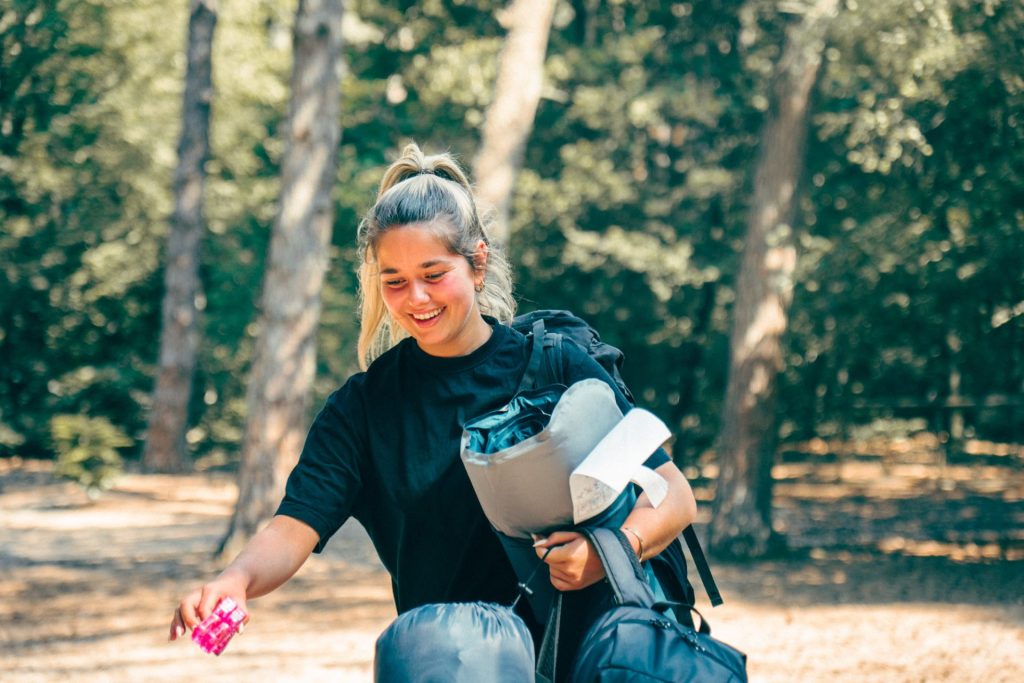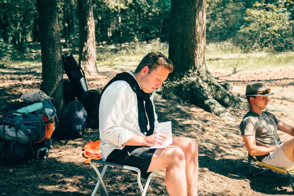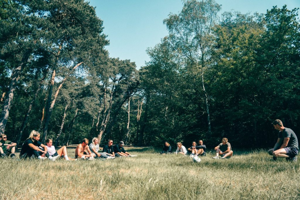 J: Klopt. We beginnen in de ochtend. Als we aankomen zorgen we voor tijd om even te landen. Denk aan je slaapplekje opbouwen met een zeil, touw en haringen. Het is heel grappig om te zien dat sommigen samen gaan liggen en anderen een plekje totaal voor zichzelf gaan maken. Daarna openen wij Expeditie Innerfonk waarbij we gelijk als eerste alle telefoons innemen. We vragen dan ‘Wat leg je weg?’. Voor de een is dat een gezin en voor de ander is het een TikTok verslaving, haha. Na het inlevermoment gaan we lunchen en een stukje wandelen. Op dag 1 startte we met een oefening over kernwaarden. Even teruggaan naar het middelpunt. We koken daarna met zijn allen het avondeten. Heel basic, maar iedereen was heel blij. ‘s Avonds deden we nog een oefening over de levenslijn en toen was het tijd om te slapen. Dagen 2 en 3 zagen er eigenlijk hetzelfde uit. Samen eten, oefeningen doen en tussendoor de gezelligheid opzoeken door een potje weerwolven.