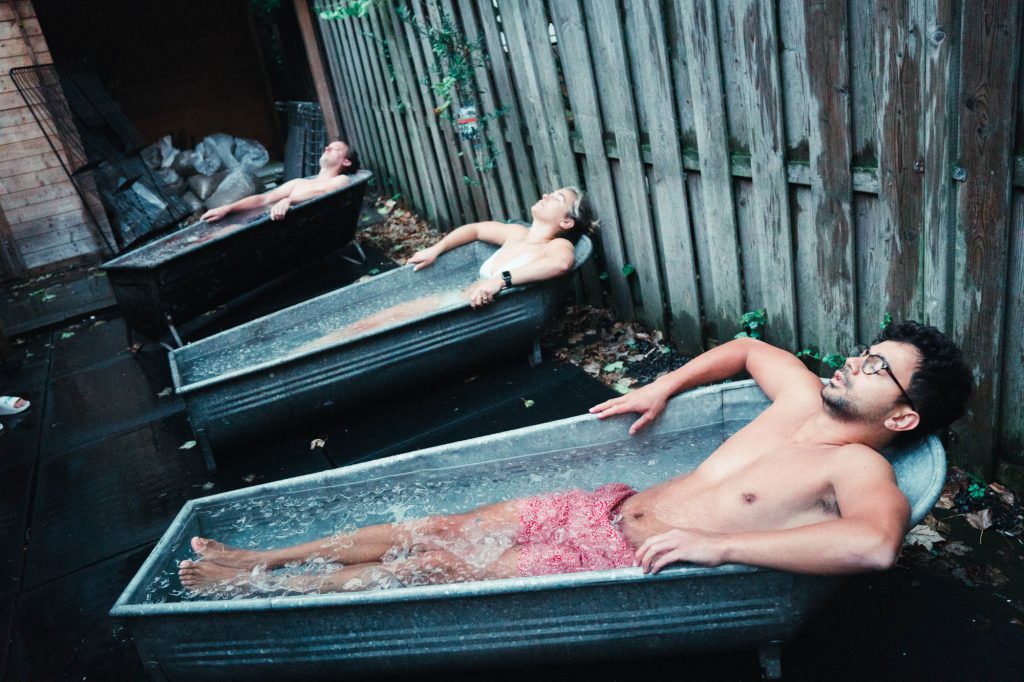 Ietwat licht in onze hoofden liepen we terug naar kantoor. In de tuin stonden de ijsbaden al klaar. Het moment suprême was aangebroken! Na een kleine warming up konden de eerste drie Fonkianen het bad in. Het was even door de zure appel heen bijten de eerste tien seconden, maar daarna was het prima te doen. De een vond het chiller dan de ander, maar feit is dat we het àllemaal gedaan hebben! Is wel een schouderklopje waard, toch?