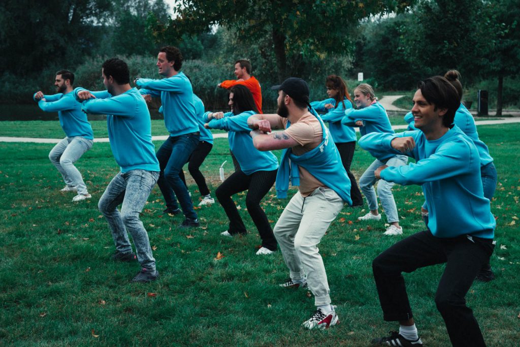 Wij Fonkianen zijn natuurlijk de moeilijkste niet, dus zo gezegd, zo gedaan. Vol energie vertrokken we richting het Griftpark. Eenmaal aangekomen, kwam instructeur Robert al snel tevoorschijn. Na een korte uitleg over de achtergrond van de Haka, konden we aan de slag. Ietwat onwennig, want laten we wel wezen: om tien uur ‘s ochtends met je collega’s ceremoniële dansen oefenen in het park is geen dagelijkse kost voor iedereen. Maar al snel hadden we de smaak te pakken. Nadat we het ritme hadden gevonden (voor de een wat makkelijker dan voor de ander) en de tekst was uitgeschreven op het whiteboard, konden we de bewegingen gaan leren. Voor je het wist, stonden we met tientallen Fonkianen te schreeuwen en te springen in het Griftpark. Het werd een groot succes.