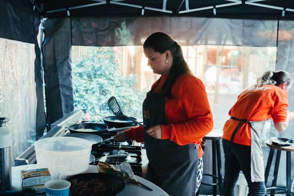 De spits is eraf en dag twee van de Focusweek is aangebroken. Om 9.00 uur was het hele pand gevuld met Fonkianen en kon iedereen aan de slag. Overal op kantoor werd hard aan de projecten van deze week gewerkt. Ook Team HR was druk in de weer, zij waren vanaf ‘s ochtends vroeg bezig om de tuin om te bouwen tot een pannenkoekenhuis. Al snel rook je de geur van pannenkoeken door het hele pand. Astrid, Niels en Myrthe stonden pannenkoeken te bakken alsof hun leven ervanaf hing. En terecht, want er zijn flink wat pannenkoeken doorheen gegaan. Er waren hartige pannenkoeken met spek en kaas voor de liefhebbers, maar vooral de zoetekauwen konden hun hart ophalen. Brownies, Kinderchocola, Kinderbueno’s, Oreo’s en Nutella stonden klaar om heel wat gaatjes in onze gebitten te veroorzaken. En vooruit: een bakje aardbeien voor de vitamine C. Met gevulde magen konden we weer aan het werk!