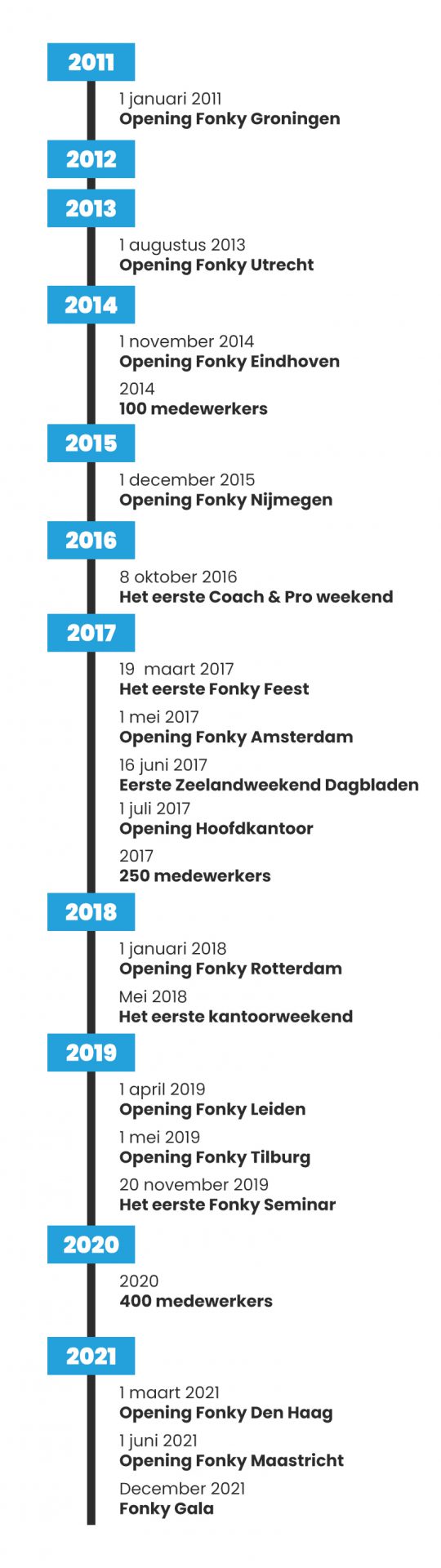 Hoera, Fonky bestaat 10 jaar! De hoogste tijd voor een feestje. En wie jarig is trakteert. Daarom willen we samen met jou terugblikken naar legendarische hoogtepunten en mijlpalen. Op deze pagina spreken we Fonkianen over hun eerste kantoorweekend, tripjes naar Marrakech en de iconische Zeelandweekenden. We delen aftermovies van befaamde Fonky Feesten, het unieke Fonky Seminar en nog veel meer…